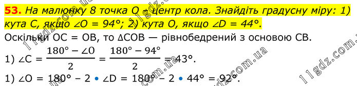 53. На малюнку 8 точка O – центр кола. Знайдіть градусну міру: 1) кута C, якщо ∠O = 94°; 2) кута O, якщо ∠D = 44°. Оскільки OС = OВ, то ∆СOВ — рівнобедрений з основою СВ. 1) ∠С = (180° - ∠О)/2 = (180° - 94°)/2 = 43°. 2) ∠O = 180° – 2 • ∠D = 180° – 2 • 44° = 92°.