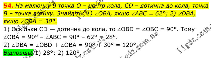 54. На малюнку 9 точка O – центр кола, CD – дотична до кола, точка B – точка дотику. Знайдіть: 1) ∠OBA, якщо ∠ABC = 62°; 2) ∠DBA, якщо ∠OBA = 30°. 1) Оскільки СD — дотична до кола, то ∠OBD = ∠OBC = 90°. Тому ∠OBA = 90° – ∠ABC = 90° – 62° = 28°. 2) ∠DBA = ∠OBD + ∠OBA = 90° + 30° = 120°. Відповідь. 1) 28°; 2) 120°.
