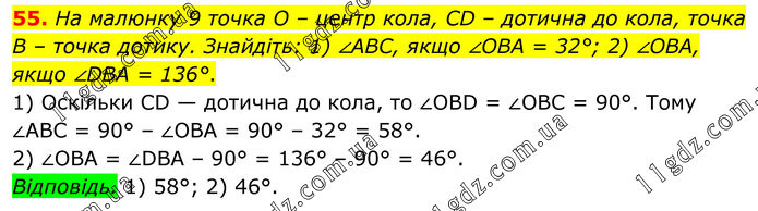 55. На малюнку 9 точка O – центр кола, CD – дотична до кола, точка B – точка дотику. Знайдіть: 1) ∠ABC, якщо ∠OBA = 32°; 2) ∠OBA, якщо ∠DBA = 136°. 1) Оскільки СD — дотична до кола, то ∠OBD = ∠OBC = 90°. Тому ∠ABC = 90° – ∠OBA = 90° – 32° = 58°. 2) ∠OBA = ∠DBA – 90° = 136° – 90° = 46°. Відповідь. 1) 58°; 2) 46°.