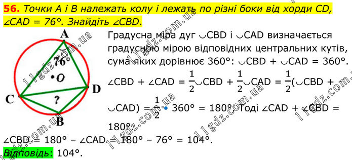 56. Точки A і B належать колу і лежать по різні боки від хорди CD, ∠CAD = 76°. Знайдіть ∠CBD. Градусна міра дуг ◡CBD і ◡CAD визначається градусною мірою відповідних центральних кутів, сума яких дорівнює 360°: ◡CBD + ◡CAD = 360°. ∠CBD + ∠CAD = 1/2◡CBD + 1/2◡CAD = 1/2(◡CBD + ◡CAD) = 1/2 • 360° = 180°. Тоді ∠CAD + ∠CBD = 180°. ∠CBD = 180° – ∠CAD = 180° – 76° = 104°. Відповідь: 104°.