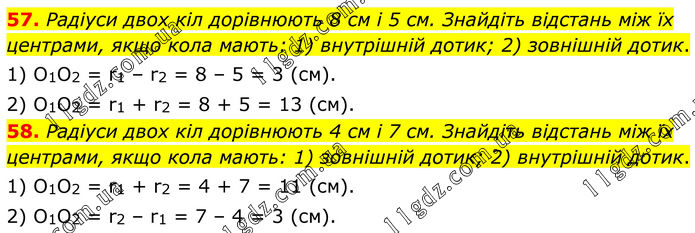 57. Радіуси двох кіл дорівнюють 8 см і 5 см. Знайдіть відстань між їх центрами, якщо кола мають: 1) внутрішній дотик; 2) зовнішній дотик. 1) O1O2 = r1 – r2 = 8 – 5 = 3 (см). 2) O1O2 = r1 + r2 = 8 + 5 = 13 (см). 58. Радіуси двох кіл дорівнюють 4 см і 7 см. Знайдіть відстань між їх центрами, якщо кола мають: 1) зовнішній дотик; 2) внутрішній дотик. 1) O1O2 = r1 + r2 = 4 + 7 = 11 (см). 2) O1O2 = r2 – r1 = 7 – 4 = 3 (см).