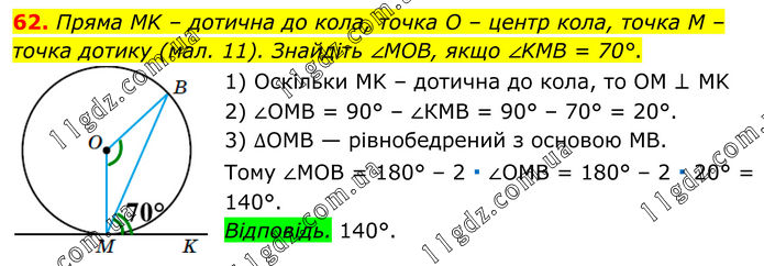 62. Пряма MK – дотична до кола, точка O – центр кола, точка M –точка дотику (мал. 11). Знайдіть ∠MOB, якщо ∠KMB = 70°. 1) Оскільки MK – дотична до кола, то OM ⊥ MK 2) ∠OMВ = 90° – ∠КМВ = 90° – 70° = 20°. 3) ∆OMВ — рівнобедрений з основою MВ. Тому ∠MOВ = 180° – 2 ∙ ∠OMВ = 180° – 2 ∙ 20° = 140°. Відповідь. 140°.