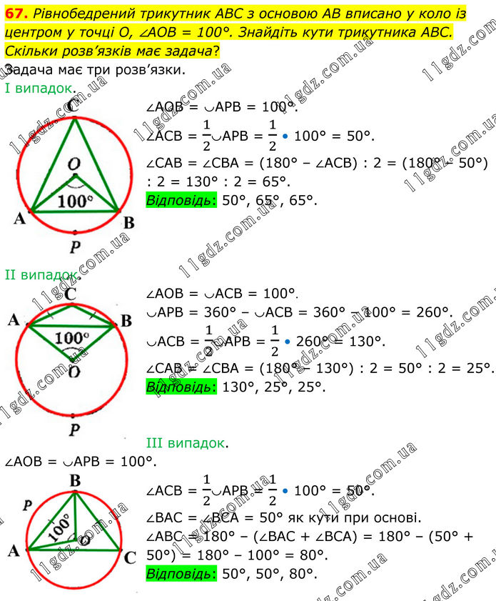 67. Рівнобедрений трикутник ABC з основою AB вписано у коло із центром у точці O, ∠AOB = 100°. Знайдіть кути трикутника ABC. Скільки розв’язків має задача? Задача має три розв’язки. І випадок. ∠АОВ = ◡АРВ = 100°. ∠АСВ = 1/2◡АРВ = 1/2 • 100° = 50°. ∠САВ = ∠СВА = (180° – ∠АСВ) : 2 = (180° – 50°) : 2 = 130° : 2 = 65°. Відповідь: 50°, 65°, 65°. II випадок. ∠АОВ = ◡АСВ = 100°. ◡АРВ = 360° – ◡АСВ = 360° – 100° = 260°. ◡АСВ = 1/2◡АРВ = 1/2 • 260° = 130°. ∠САВ = ∠СВА = (180° – 130°) : 2 = 50° : 2 = 25°. Відповідь: 130°, 25°, 25°. III випадок. ∠АОВ = ◡АРВ = 100°. ∠АСВ = 1/2◡АРВ = 1/2 • 100° = 50°. ∠ВАС = ∠ВСА = 50° як кути при основі. ∠АВС = 180° – (∠ВАС + ∠ВСА) = 180° – (50° + 50°) = 180° – 100° = 80°. Відповідь: 50°, 50°, 80°.