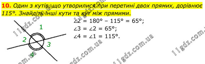 10. Один з кутів, що утворилися при перетині двох прямих, дорівнює 115°. Знайдіть інші кути та кут між прямими. ∠2 = 180° – 115° = 65°; ∠3 = ∠2 = 65°; ∠4 = ∠1 = 115°.