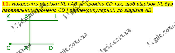 11. Накресліть відрізки KL і AB та промінь CD так, щоб відрізок KL був паралельний променю CD і перпендикулярний до відрізка AB.