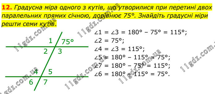 12. Градусна міра одного з кутів, що утворилися при перетині двох паралельних прямих січною, дорівнює 75°. Знайдіть градусні міри решти семи кутів. ∠1 = ∠3 = 180° – 75° = 115°; ∠2 = 75°; ∠4 = ∠3 = 115°; ∠5 = 180° – 115° = 75°; ∠7 = 180° – 75° = 115°; ∠6 = 180° – 115° = 75°.