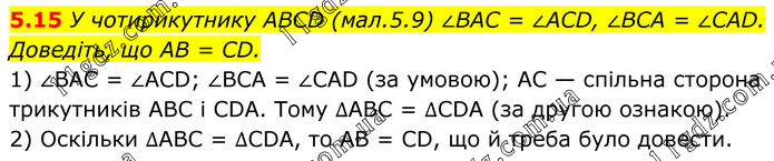 5.15 У чотирикутнику ABCD (мал.5.9) ∠BAC = ∠ACD, ∠BCA = ∠CAD. Доведіть, що AB = CD. 1) ∠BAC = ∠ACD; ∠BCA = ∠CAD (за умовою); AC — спільна сторона трикутників ABC і CDA. Тому ∆ABC = ∆CDA (за другою ознакою). 2) Оскільки ∆ABC = ∆CDA, то AB = CD, що й треба було довести.