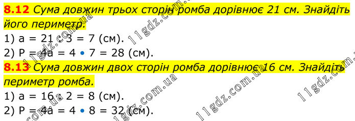 8.12 Сума довжин трьох сторін ромба дорівнює 21 см. Знайдіть його периметр. 1) а = 21 : 3 = 7 (см). 2) P = 4а = 4 • 7 = 28 (см). 8.13 Сума довжин двох сторін ромба дорівнює 16 см. Знайдіть периметр ромба. 1) а = 16 : 2 = 8 (см). 2) P = 4а = 4 • 8 = 32 (см).
