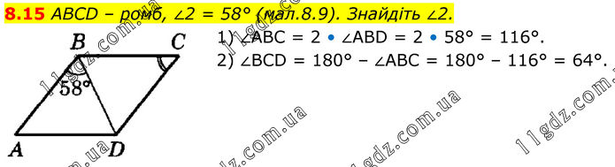 8.15 ABCD – ромб, ∠2 = 58° (мал.8.9). Знайдіть ∠2. 1) ∠ABC = 2 • ∠ABD = 2 • 58° = 116°. 2) ∠BCD = 180° – ∠ABC = 180° – 116° = 64°.
