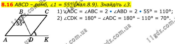 8.16 ABCD – ромб, ∠1 = 55° (мал.8.9). Знайдіть ∠3. 1) ∠ADC = ∠ABC = 2 • ∠ABD = 2 • 55° = 110°; 2) ∠CDK = 180° – ∠ADC = 180° – 110° = 70°.