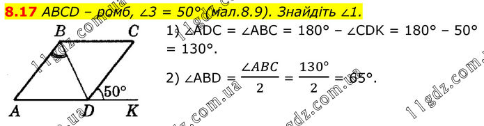 8.17 ABCD – ромб, ∠3 = 50° (мал.8.9). Знайдіть ∠1. 1) ∠ADC = ∠ABC = 180° – ∠CDK = 180° – 50° = 130°. 2) ∠ABD = (∠ABC)/2 = (130°)/2 = 65°.