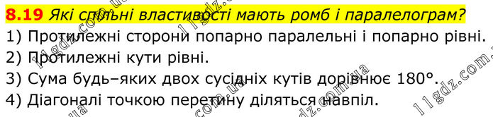 8.19 Які спільні властивості мають ромб і паралелограм? 1) Протилежні сторони попарно паралельні і попарно рівні. 2) Протилежні кути рівні. 3) Сума будь–яких двох сусідніх кутів дорівнює 180°. 4) Діагоналі точкою перетину діляться навпіл.