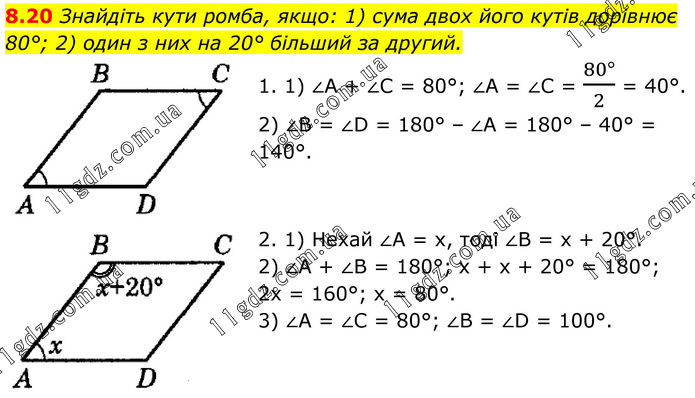 8.20 Знайдіть кути ромба, якщо: 1) сума двох його кутів дорівнює 80°; 2) один з них на 20° більший за другий. 1. 1) ∠A + ∠C = 80°; ∠A = ∠C = (80°)/2 = 40°. 2) ∠B = ∠D = 180° – ∠A = 180° – 40° = 140°. 2. 1) Нехай ∠A = х, тоді ∠B = х + 20°. 2) ∠A + ∠B = 180°; х + х + 20° = 180°; 2х = 160°; х = 80°. 3) ∠A = ∠C = 80°; ∠B = ∠D = 100°.