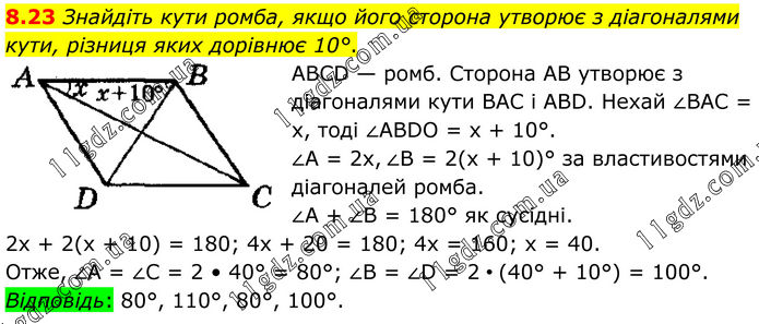 8.23 Знайдіть кути ромба, якщо його сторона утворює з діагоналями кути, різниця яких дорівнює 10°. АВСD — ромб. Сторона АВ утворює з діагоналями кути ВАС і АВD. Нехай ∠ВАС = х, тоді ∠АBDО = х + 10°. ∠А = 2х, ∠В = 2(х + 10)° за властивостями діагоналей ромба. ∠А + ∠В = 180° як сусідні. 2х + 2(х + 10) = 180; 4х + 20 = 180; 4х = 160; х = 40. Отже, ∠А = ∠С = 2 • 40° = 80°; ∠В = ∠D = 2 • (40° + 10°) = 100°. Відповідь: 80°, 110°, 80°, 100°.