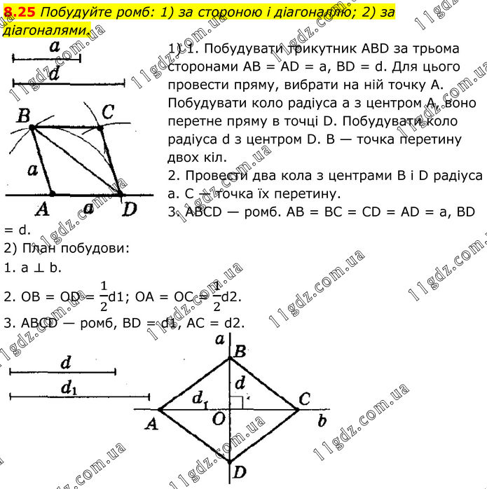 8.25 Побудуйте ромб: 1) за стороною і діагоналлю; 2) за діагоналями. 1) 1. Побудувати трикутник АВD за трьома сторонами АВ = АD = а, ВD = d. Для цього провести пряму, вибрати на ній точку А. Побудувати коло радіуса а з центром А, воно перетне пряму в точці D. Побудувати коло радіуса d з центром D. В — точка перетину двох кіл. 2. Провести два кола з центрами В і D радіуса а. С — точка їх перетину. 3. АВСD — ромб. АВ = ВС = СD = АD = а, ВD = d. 2) План побудови: 1. а ⟂ b. 2. OB = OD = 1/2d1; OA = OC = 1/2d2. 3. АВСD — ромб, ВD = d1, АС = d2.