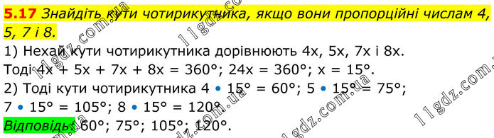 5.17 Знайдіть кути чотирикутника, якщо вони пропорційні числам 4, 5, 7 і 8. 1) Нехай кути чотирикутника дорівнюють 4х, 5х, 7x і 8х. Тоді 4x + 5х + 7x + 8х = 360°; 24х = 360°; х = 15°. 2) Тоді кути чотирикутника 4 • 15° = 60°; 5 • 15° = 75°; 7 • 15° = 105°; 8 • 15° = 120°. Відповідь: 60°; 75°; 105°; 120°.