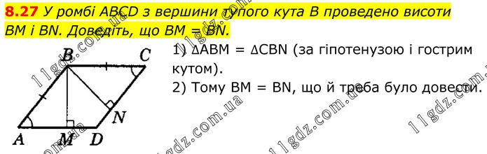 8.27 У ромбі ABCD з вершини тупого кута B проведено висоти BM і BN. Доведіть, що BM = BN. 1) ∆ABM = ∆CBN (за гіпотенузою і гострим кутом). 2) Тому BM = BN, що й треба було довести.