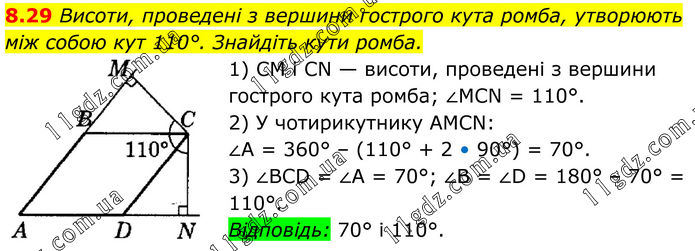 8.29 Висоти, проведені з вершини гострого кута ромба, утворюють між собою кут 110°. Знайдіть кути ромба. 1) CM і CN — висоти, проведені з вершини гострого кута ромба; ∠MCN = 110°. 2) У чотирикутнику AMCN: ∠A = 360° – (110° + 2 • 90°) = 70°. 3) ∠BCD = ∠A = 70°; ∠B = ∠D = 180° – 70° = 110°. Відповідь: 70° і 110°.