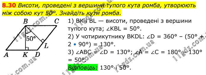 8.30 Висоти, проведені з вершини тупого кута ромба, утворюють між собою кут 50°. Знайдіть кути ромба. 1) BK і BL — висоти, проведені з вершини тупого кута; ∠KBL = 50°. 2) У чотирикутнику BKDL: ∠D = 360° – (50° + 2 • 90°) = 130°. 3) ∠ABC = ∠D = 130°; ∠A = ∠C = 180° – 130° = 50°. Відповідь: 130° і 50°.