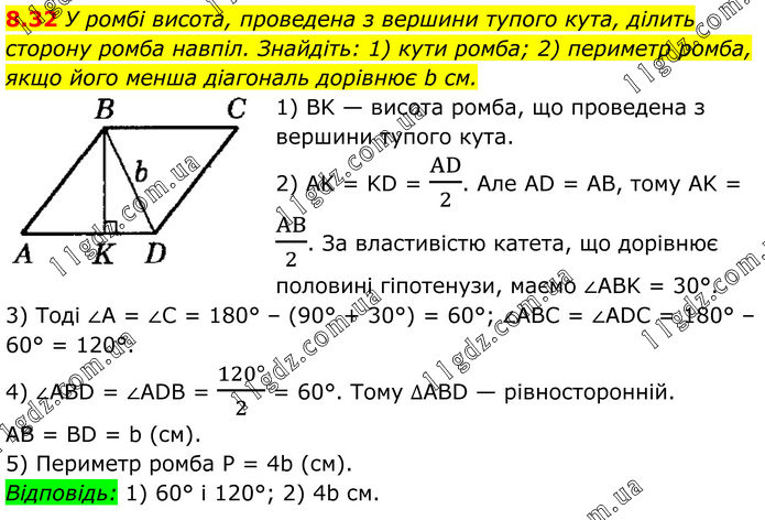 8.32 У ромбі висота, проведена з вершини тупого кута, ділить сторону ромба навпіл. Знайдіть: 1) кути ромба; 2) периметр ромба, якщо його менша діагональ дорівнює b см. 1) BK — висота ромба, що проведена з вершини тупого кута. 2) AK = KD = AD/2. Але AD = AB, тому AK = AB/2. За властивістю катета, що дорівнює половині гіпотенузи, маємо ∠ABK = 30°. 3) Тоді ∠A = ∠C = 180° – (90° + 30°) = 60°; ∠ABC = ∠ADC = 180° – 60° = 120°. 4) ∠ABD = ∠ADB = (120°)/2 = 60°. Тому ∆ABD — рівносторонній. AB = BD = b (см). 5) Периметр ромба P = 4b (см). Відповідь: 1) 60° і 120°; 2) 4b см.