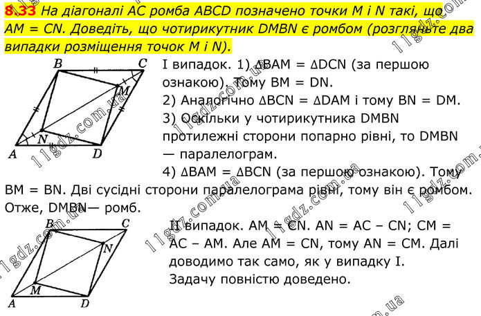 8.33 На діагоналі AC ромба ABCD позначено точки M і N такі, що AM = CN. Доведіть, що чотирикутник DMBN є ромбом (розгляньте два випадки розміщення точок M і N). І випадок. 1) ∆ВАМ = ∆DCN (за першою ознакою). Тому BM = DN. 2) Аналогічно ∆BCN = ∆DAM і тому BN = DM. 3) Оскільки у чотирикутника DMBN протилежні сторони попарно рівні, то DMBN — паралелограм. 4) ∆ВАМ = ∆BCN (за першою ознакою). Тому BM = BN. Дві сусідні сторони паралелограма рівні, тому він є ромбом. Отже, DMBN— ромб. II випадок. AM = CN. AN = AC – CN; CM = AC – AM. Але AM = CN, тому AN = CM. Далі доводимо так само, як у випадку І. Задачу повністю доведено.