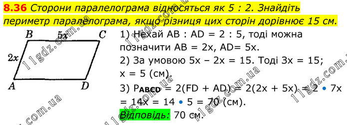 8.36 Сторони паралелограма відносяться як 5 : 2. Знайдіть периметр паралелограма, якщо різниця цих сторін дорівнює 15 см. 1) Нехай AB : AD = 2 : 5, тоді можна позначити AB = 2х, AD= 5х. 2) За умовою 5х – 2х = 15. Тоді Зх = 15; х = 5 (см). 3) PABCD = 2(FD + AD) = 2(2х + 5х) = 2 • 7x = 14х = 14 • 5 = 70 (см). Відповідь: 70 см.