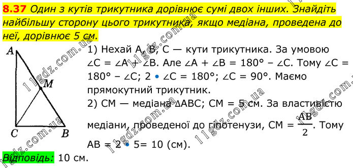 8.37 Один з кутів трикутника дорівнює сумі двох інших. Знайдіть найбільшу сторону цього трикутника, якщо медіана, проведена до неї, дорівнює 5 см. 1) Нехай А, В, C — кути трикутника. За умовою ∠C = ∠A + ∠B. Але ∠A + ∠B = 180° – ∠C. Тому ∠C = 180° – ∠C; 2 • ∠C = 180°; ∠C = 90°. Маємо прямокутний трикутник. 2) CM — медіана ∆ABC; CM = 5 см. За властивістю медіани, проведеної до гіпотенузи, CM = AB/2. Тому AB = 2 • 5= 10 (см). Відповідь: 10 см.