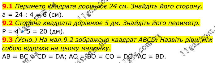 9.1 Периметр квадрата дорівнює 24 см. Знайдіть його сторону. а = 24 : 4 = 6 (см). 9.2 Сторона квадрата дорівнює 5 дм. Знайдіть його периметр. P = 4 • 5 = 20 (дм). 9.3 На мал.9.2 зображено квадрат ABCD. Назвіть рівні між собою відрізки на цьому малюнку. AB = BC = CD = DA; AO = BO = CO = DO; AC = BD.