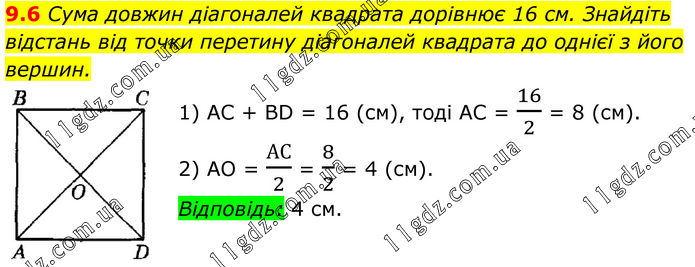 9.6 Сума довжин діагоналей квадрата дорівнює 16 см. Знайдіть відстань від точки перетину діагоналей квадрата до однієї з його вершин. 1) AC + BD = 16 (см), тоді АС = 16/2 = 8 (см). 2) АО = АС/2 = 8/2 = 4 (см). Відповідь: 4 см.