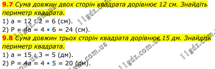 9.7 Сума довжин двох сторін квадрата дорівнює 12 см. Знайдіть периметр квадрата. 1) а = 12 : 2 = 6 (см). 2) P = 4а = 4 • 6 = 24 (см). 9.8 Сума довжин трьох сторін квадрата дорівнює 15 дм. Знайдіть периметр квадрата. 1) а = 15 : 3 = 5 (дм). 2) P = 4а = 4 • 5 = 20 (дм).