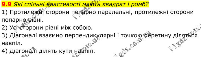 9.9 Які спільні властивості мають квадрат і ромб? 1) Протилежні сторони попарно паралельні, протилежні сторони попарно рівні. 2) Усі сторони рівні між собою. 3) Діагоналі взаємно перпендикулярні і точкою перетину діляться навпіл. 4) Діагоналі ділять кути навпіл.