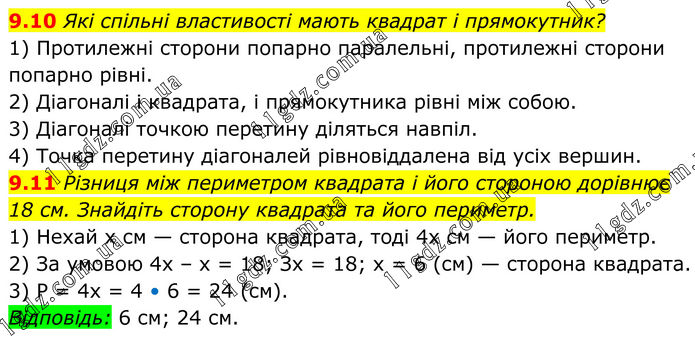 9.10 Які спільні властивості мають квадрат і прямокутник? 1) Протилежні сторони попарно паралельні, протилежні сторони попарно piвні. 2) Діагоналі і квадрата, і прямокутника рівні між собою. 3) Діагоналі точкою перетину діляться навпіл. 4) Точка перетину діагоналей рівновіддалена від усіх вершин. 9.11 Різниця між периметром квадрата і його стороною дорівнює 18 см. Знайдіть сторону квадрата та його периметр. 1) Нехай х см — сторона квадрата, тоді 4х см — його периметр. 2) За умовою 4х – х = 18; Зх = 18; х = 6 (см) — сторона квадрата. 3) P = 4х = 4 • 6 = 24 (см). Відповідь: 6 см; 24 см.