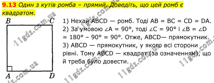 9.13 Один з кутів ромба – прямий. Доведіть, що цей ромб є квадратом. 1) Нехай ABCD — ромб. Тоді AB = BC = CD = DA. 2) За умовою ∠A = 90°, тоді ∠C = 90° і ∠B = ∠D = 180° – 90° = 90°. Отже, ABCD— прямокутник. 3) ABCD — прямокутник, у якого всі сторони рівні. Тому ABCD — квадрат (за означенням), що й треба було довести.