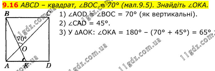 9.16 ABCD – квадрат, ∠BOC = 70° (мал.9.5). Знайдіть ∠OKA. 1) ∠AOD = ∠BOC = 70° (як вертикальні). 2) ∠CAD = 45°. 3) У ∆АОК: ∠OKA = 180° – (70° + 45°) = 65°.