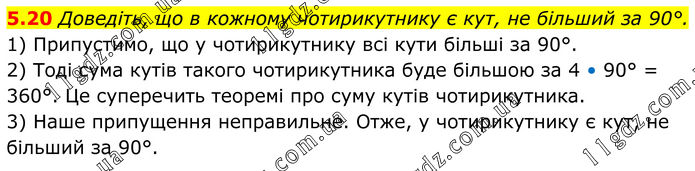 5.20 Доведіть, що в кожному чотирикутнику є кут, не більший за 90°. 1) Припустимо, що у чотирикутнику всі кути більші за 90°. 2) Тоді сума кутів такого чотирикутника буде більшою за 4 • 90° = 360°. Це суперечить теоремі про суму кутів чотирикутника. 3) Наше припущення неправильне. Отже, у чотирикутнику є кут, не більший за 90°.
