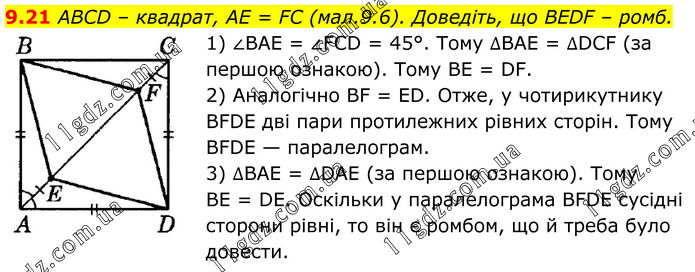 9.21 ABCD – квадрат, AE = FC (мал.9.6). Доведіть, що BEDF – ромб. 1) ∠BAE = ∠FCD = 45°. Тому ∆BAE = ∆DCF (за першою ознакою). Тому BE = DF. 2) Аналогічно BF = ED. Отже, у чотирикутнику BFDE дві пари протилежних рівних сторін. Тому BFDE — паралелограм. 3) ∆BAE = ∆DAE (за першою ознакою). Тому BE = DE. Оскільки у паралелограма BFDE сусідні сторони рівні, то він є ромбом, що й треба було довести.