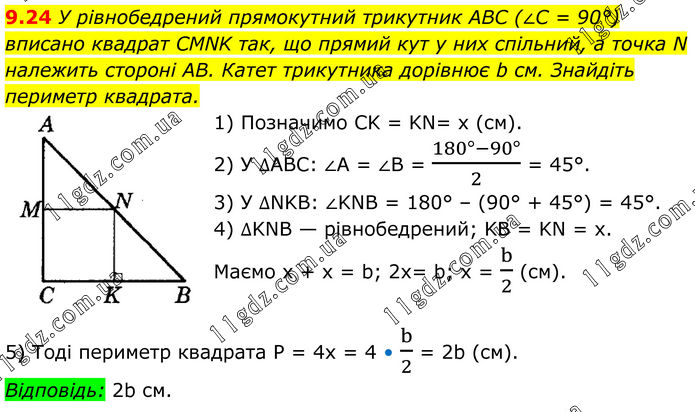 9.24 У рівнобедрений прямокутний трикутник ABC (∠C = 90°) вписано квадрат CMNK так, що прямий кут у них спільний, а точка N належить стороні AB. Катет трикутника дорівнює b см. Знайдіть периметр квадрата. 1) Позначимо CK = KN= х (см). 2) У ∆ABC: ∠A = ∠B = (180°-90°)/2 = 45°. 3) У ∆NKB: ∠KNB = 180° – (90° + 45°) = 45°. 4) ∆KNB — рівнобедрений; KB = KN = х. Маємо х + х = b; 2х= b; х = b/2 (см). 5) Тоді периметр квадрата P = 4х = 4 • b/2 = 2b (см). Відповідь: 2b см.