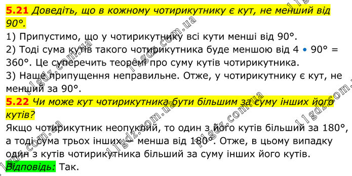 5.21 Доведіть, що в кожному чотирикутнику є кут, не менший від 90°. 1) Припустимо, що у чотирикутнику всі кути менші від 90°. 2) Тоді сума кутів такого чотирикутника буде меншою від 4 • 90° = 360°. Це суперечить теоремі про суму кутів чотирикутника. 3) Наше припущення неправильне. Отже, у чотирикутнику є кут, не менший за 90°. 5.22 Чи може кут чотирикутника бути більшим за суму інших його кутів? Якщо чотирикутник неопуклий, то один з його кутів більший за 180°, а тоді сума трьох інших — менша від 180°. Отже, в цьому випадку один з кутів чотирикутника більший за суму інших його кутів. Відповідь: Так.