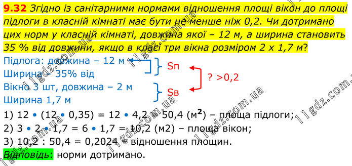 9.32 Згідно із санітарними нормами відношення площі вікон до площі підлоги в класній кімнаті має бути не менше ніж 0,2. Чи дотримано цих норм у класній кімнаті, довжина якої – 12 м, а ширина становить 35 % від довжини, якщо в класі три вікна розміром 2 х 1,7 м? Підлога: довжина – 12 м Ширина – 35% від Вікно 3 шт, довжина – 2 м Ширина 1,7 м 1) 12 • (12 • 0,35) = 12 • 4,2 = 50,4 (м2) – площа підлоги; 2) 3 • 2 • 1,7 = 6 • 1,7 = 10,2 (м2) – площа вікон; 3) 10,2 : 50,4 = 0,2024 – відношення площин. Відповідь: норми дотримано.