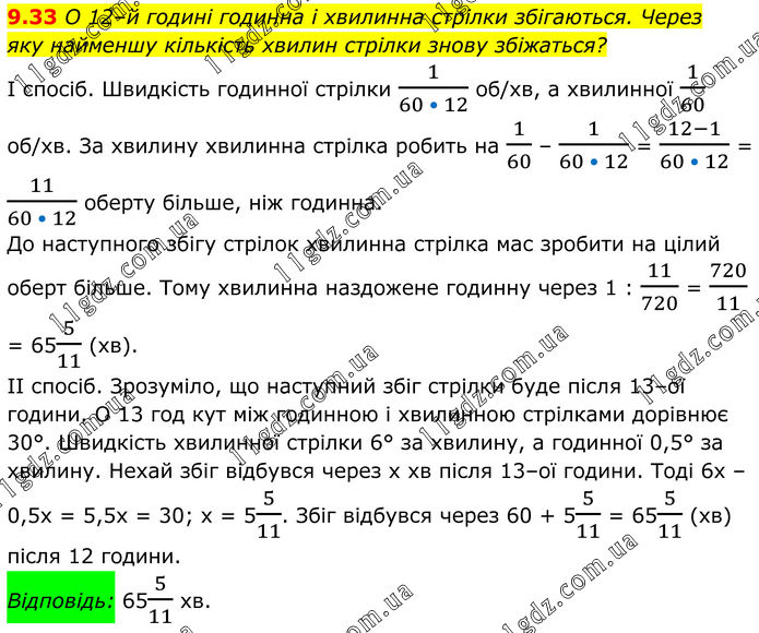 9.33 О 12–й годині годинна і хвилинна стрілки збігаються. Через яку найменшу кількість хвилин стрілки знову збіжаться? І спосіб. Швидкість годинної стрілки 1/(60 • 12) об/хв, а хвилинної 1/60 об/хв. Зa хвилину хвилинна стрілка робить на 1/60 – 1/(60 • 12) = (12-1)/(60 • 12) = 11/(60 • 12) оберту більше, ніж годинна. До наступного збігу стрілок хвилинна стрілка мас зробити на цілий оберт більше. Тому хвилинна наздожене годинну через 1 : 11/720 = 720/11 = 655/11 (хв). ІІ спосіб. Зрозуміло, що наступний збіг стрілки буде після 13–ої години. O 13 год кут між годинною і хвилинною стрілками дорівнює 30°. Швидкість хвилинної стрілки 6° за хвилину, а годинної 0,5° за хвилину. Нехай збіг відбувся через х хв після 13–ої години. Тоді 6х – 0,5х = 5,5х = 30; х = 55/11. Збіг відбувся через 60 + 55/11 = 655/11 (хв) після 12 години. Відповідь: 655/11 хв.