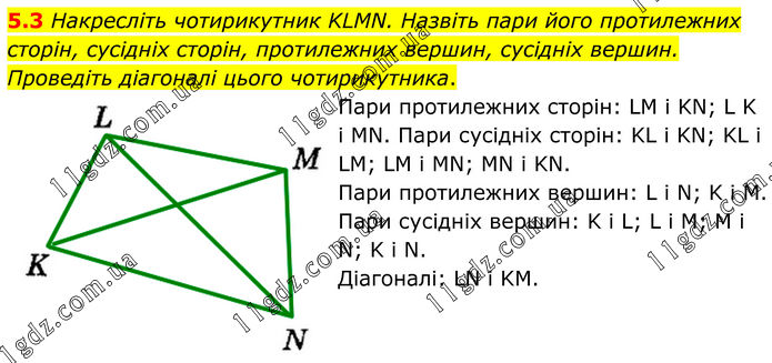 5.3 Накресліть чотирикутник KLMN. Назвіть пари його протилежних сторін, сусідніх сторін, протилежних вершин, сусідніх вершин. Проведіть діагоналі цього чотирикутника. Пари протилежних сторін: LM і KN; L K і MN. Пари сусідніх сторін: KL і KN; KL і LM; LM і MN; MN і KN. Пари протилежних вершин: L і N; K і М. Пари сусідніх вершин: K і L; L і М; M і N; K і N. Діагоналі: LN і KM.