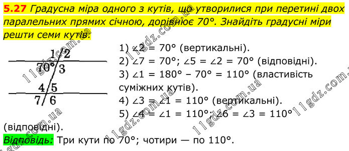 5.27 Градусна міра одного з кутів, що утворилися при перетині двох паралельних прямих січною, дорівнює 70°. Знайдіть градусні міри решти семи кутів. 1) ∠2 = 70° (вертикальні). 2) ∠7 = 70°; ∠5 = ∠2 = 70° (відповідні). 3) ∠1 = 180° – 70° = 110° (властивість суміжних кутів). 4) ∠3 = ∠1 = 110° (вертикальні). 5) ∠4 = ∠1 = 110°; ∠6 = ∠3 = 110° (відповідні). Відповідь: Три кути по 70°; чотири — по 110°.