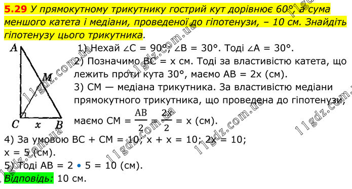 5.29 У прямокутному трикутнику гострий кут дорівнює 60°, а сума меншого катета і медіани, проведеної до гіпотенузи, – 10 см. Знайдіть гіпотенузу цього трикутника. 1) Нехай ∠C = 90°; ∠B = 30°. Тоді ∠A = 30°. 2) Позначимо BC = х см. Тоді за властивістю катета, що лежить проти кута 30°, маємо AB = 2х (см). 3) CM — медіана трикутника. За властивістю медіани прямокутного трикутника, що проведена до гіпотенузи, маємо CM = АВ/2 = 2х/2 = х (см). 4) За умовою BC + CM = 10; х + х = 10; 2х = 10; х = 5 (см). 5) Тоді AB = 2 • 5 = 10 (см). Відповідь: 10 см.