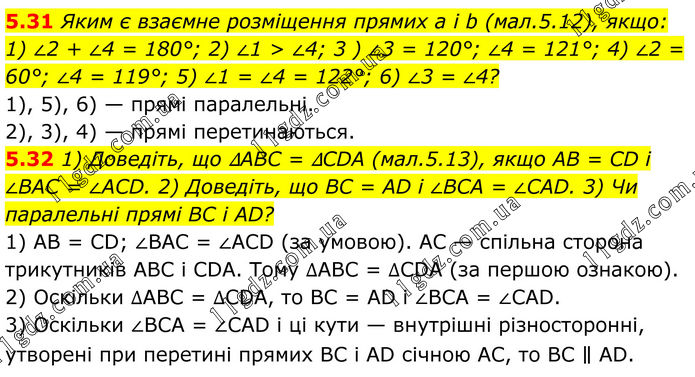5.31 Яким є взаємне розміщення прямих а і b (мал.5.12), якщо: 1) ∠2 + ∠4 = 180°; 2) ∠1 > ∠4; 3 ) ∠3 = 120°; ∠4 = 121°; 4) ∠2 = 60°; ∠4 = 119°; 5) ∠1 = ∠4 = 122°; 6) ∠3 = ∠4? 1), 5), 6) — прямі паралельні. 2), 3), 4) — прямі перетинаються. 5.32 1) Доведіть, що ∆ABC = ∆CDA (мал.5.13), якщо AB = CD і ∠BAC = ∠ACD. 2) Доведіть, що BC = AD і ∠BCA = ∠CAD. 3) Чи паралельні прямі BC і AD? 1) AB = CD; ∠BAC = ∠ACD (за умовою). AC — спільна сторона трикутників ABC і CDA. Тому ∆ABC = ∆CDA (за першою ознакою). 2) Оскільки ∆ABC = ∆CDA, то BC = AD і ∠BCA = ∠CAD. 3) Оскільки ∠BCA = ∠CAD і ці кути — внутрішні різносторонні, утворені при перетині прямих BC і AD січною AC, то BC ∥ AD.