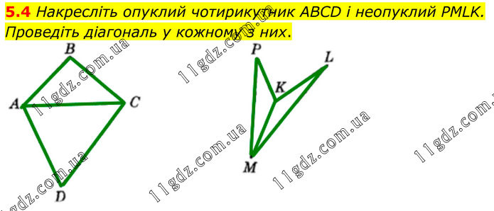 5.4 Накресліть опуклий чотирикутник ABCD і неопуклий PMLK. Проведіть діагональ у кожному з них.