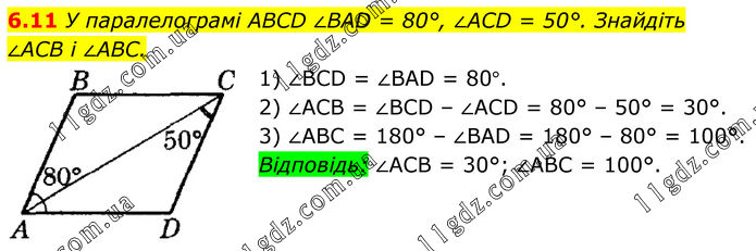 6.11 У паралелограмі ABCD ∠BAD = 80°, ∠ACD = 50°. Знайдіть ∠ACB і ∠ABC. 1) ∠BCD = ∠BAD = 80°. 2) ∠ACB = ∠BCD – ∠ACD = 80° – 50° = 30°. 3) ∠ABC = 180° – ∠BAD = 180° – 80° = 100°. Відповідь: ∠ACB = 30°; ∠ABC = 100°.