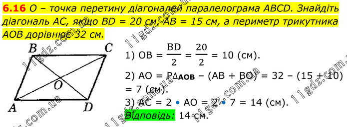 6.16 O – точка перетину діагоналей паралелограма ABCD. Знайдіть діагональ AC, якщо BD = 20 см, AB = 15 см, а периметр трикутника AOB дорівнює 32 см. 1) OB = BD/2 = 20/2 = 10 (см). 2) AO = P∆AOB – (AB + BO) = 32 – (15 + 10) = 7 (см). 3) AC = 2 • AO = 2 • 7 = 14 (см). Відповідь: 14 см.