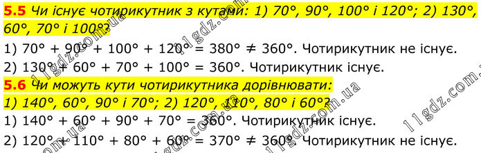 5.5 Чи існує чотирикутник з кутами: 1) 70°, 90°, 100° і 120°; 2) 130°, 60°, 70° і 100°? 1) 70° + 90° + 100° + 120° = 380° ≠ 360°. Чотирикутник не існує. 2) 130° + 60° + 70° + 100° = 360°. Чотирикутник існує. 5.6 Чи можуть кути чотирикутника дорівнювати: 1) 140°, 60°, 90° і 70°; 2) 120°, 110°, 80° і 60°? 1) 140° + 60° + 90° + 70° = 360°. Чотирикутник існує. 2) 120° + 110° + 80° + 60° = 370° ≠ 360°. Чотирикутник не існує.