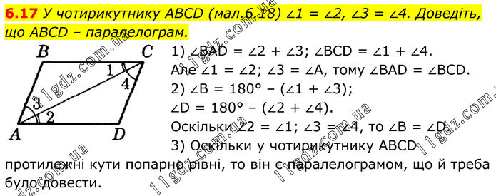 6.17 У чотирикутнику ABCD (мал.6.18) ∠1 = ∠2, ∠3 = ∠4. Доведіть, що ABCD – паралелограм. 1) ∠BAD = ∠2 + ∠3; ∠BCD = ∠1 + ∠4. Але ∠1 = ∠2; ∠3 = ∠A, тому ∠BAD = ∠BCD. 2) ∠B = 180° – (∠1 + ∠3); ∠D = 180° – (∠2 + ∠4). Оскільки ∠2 = ∠1; ∠3 = ∠4, то ∠B = ∠D. 3) Оскільки у чотирикутнику ABCD протилежні кути попарно рівні, то він є паралелограмом, що й треба було довести.