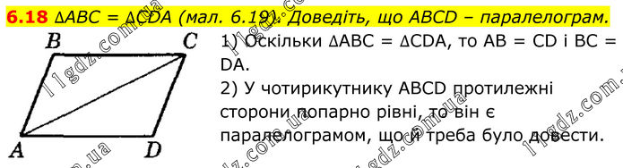 6.18 ∆ABC = ∆CDA (мал. 6.19). Доведіть, що ABCD – паралелограм. 1) Оскільки ∆ABC = ∆CDA, то AB = CD і BC = DA. 2) У чотирикутнику ABCD протилежні сторони попарно рівні, то він є паралелограмом, що й треба було довести.
